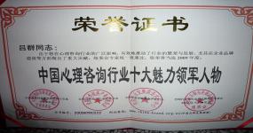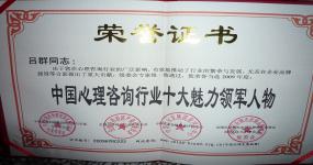 中国行业发展调查评价中心、全国行业领先企业品牌推荐组委会授予“中国心理咨询行业十大魅力领军人物”