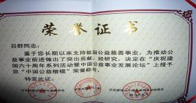 庆祝建国六十周年百名公益之星活动特邀嘉宾, 被评为“中国公益楷模”;