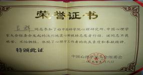 2008年中国心理学家大会特邀嘉宾。跟随5.12汶川地震心理援助团赴灾区进行心理危机干预,被评为“汶川地震心理援助志愿者先进个人、优秀心理学工作者”,在北京人民大会堂受到表彰并颁发荣誉证书;