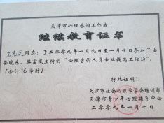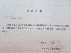 2005年8月参加津城心理培训,2006年3月获得培训证书。2006年8月获得国家二级心理咨询师资格证书。2006年开始在学校教心理健康课兼心理咨询工作。主要是针对青少年的心理问题开展工作。积累了一定的案例资料和经验。为了更好的开展工作还参加了一些心理专家培训如:2007年8月参加意象对话心理咨询与治疗初级培训。2007年7月参加曾奇峰主讲的《经典精神分析理论与治疗》培训。2007年11月参加曾奇峰主讲的《现代精神分析理论与治疗》培训。2008年7月参加曾奇峰主讲的《精神分析治疗技术培训(中级班)》的学习。2009年1月参加樊富珉的“心理咨询人员专业提高工作坊”。2009年4月参加钟小艳主讲的《认知行为治疗(CBT)培训》。2010年7月参加台湾邱敏丽主讲的《绘画治疗》培训。2009年2月参加李仑主讲的《欧文亚龙团体治疗初级工作坊》培训等等。为咨询工作打下良好的理论和技能基础。