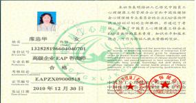 资格证书:国家二级心理咨询师;家庭教育高级指导师;人力资源中级经济师;企业EAP讲师、咨询师、执行师。