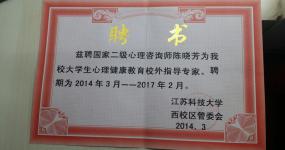 20143 20172月,江苏科技大学西校区大学生心理健康教育校外辅导专家。