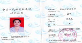 学习经历: 人力资源和社会保障部中国就业培训技术指导中心、中国青少年研究会和中国青少年研究中心培训中心共同认证的高级家庭教育指导师培训