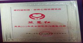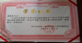 2013年,在第四届和谐世界应用心理学博览会年度评选中荣获“全国优秀心理咨询师”称号。