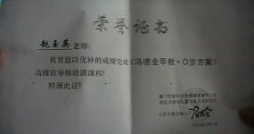 赵玉英:女,本科学历,从事教育工作已四十年,由于对教育工作的热爱,退休后就专业致志从事早期教育和家庭教育工作,2005年上半年经过培训获得了厦门《爱和乐》全能全脑音乐教育服务有限公司日照代理的资格,获得了中国早教之父——冯德全教授《0岁方案》家庭教育指导师的资格,并成立了0岁方案日照函授站,2008年12月上旬又参加了山东卫视《天下父母》栏目的推广交流会,开心妈妈咨询站又应运而生。