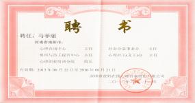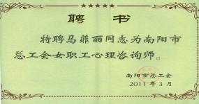 2011年3月被南阳市总工会聘请为“南阳市总工会女职工心理咨询师”。