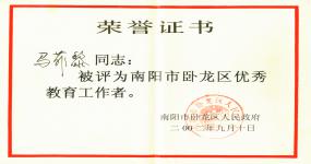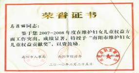 2008年被评为“南阳市维护妇女儿童权益贡献奖”个人先进。