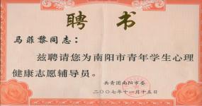 2007年被南阳市团委聘请为“青年学生心理健康志愿辅导员”。