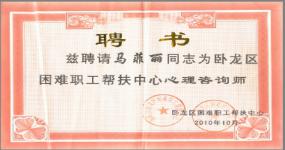 2010年10月被南阳市卧龙区困难职工帮扶中心咨询师。