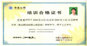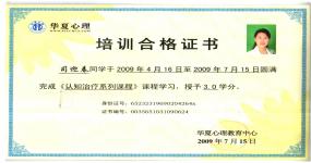 自2005年接触心理学,并报名参加远程二级咨询师证的学习且拿到国家二级心理咨询师证,同时拿到国家CETTIC职业培训合格证; 先后取得华夏心理《认知治疗系列课程》及《焦点解决短期心理咨询》的培训合格证书; 跟随樊富珉学习团体心理咨询; 跟随盛晓春学习系统式家庭治疗;跟随包剑英老师学习了力量之源的课程及NLP心理教练的中高阶课程; 跟随多位家排老师学习研修家庭系统排列。2010年11月受邀参加由北京纽瀚斯主办樊富珉主讲的“青少年团体讲师--西部女种子选手培训”的课程,开始参与相关课程。2011年8月参加爸妈在线组织的心灵导师讲师的课程培训并参加考试合格拿到国家证书,取得心灵导师讲师证。 2011年10参加朱建军意象对话课程,并拿到证书。