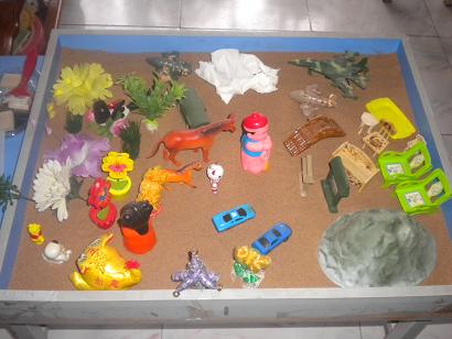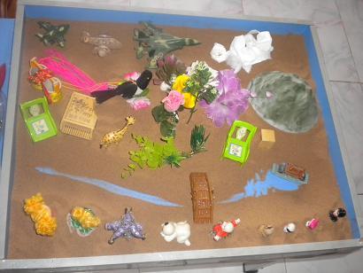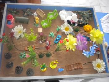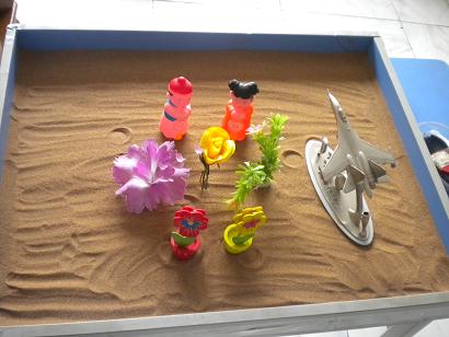 后来经引导把沙画换成了沙具,沙具有:桥、花、鸟、山、白云、飞机,鹿、凳子、河中船、椅子,钢琴,水桶。主题:同上