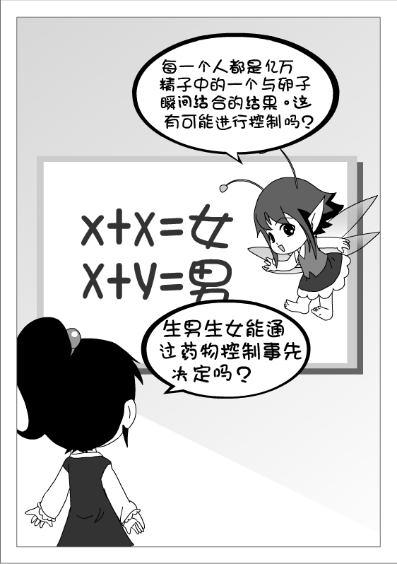 “那是江湖骗子为了骗取钱财才这样说的,这是不可能的事!因为人的性别,是由父母遗传基因中性染色体的类型所决定的。”奇妙精灵肯定地说,“一个新的生命,来源于父亲的精子与母亲的卵子结合而成的受精卵。精子细胞内的一对性染色体分为X型和Y型,而卵子细胞内的一对性染色体都是X型。如果是X精子与卵子结合(即XX),发育后生下的是女孩;如果是Y精子与卵子结合(即XY),发育后生下的就是男孩。所以,无论是生男生女,都不是父母的意愿能够决定的。”