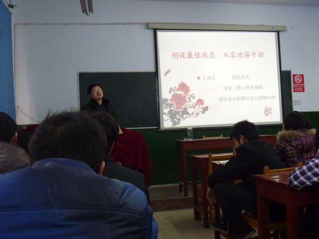 平顶山市二十六中学位于九里山南麓,是平顶山市湛河区区属全封闭式农村寄宿制初中,现有教职工七十人,学生六百余名。学校在上级教育主管领导部门的正确领导下,在校长甘新河同志的带领下,全校师生共同努力,学校蒸蒸日上,欣欣向荣,取得了2010年湛河区中招考试第一、区政府教育督导第一,省级绿色环保学校的荣誉称号。但随着学校的发展,学生的心理问题也日益突出。如:单亲家庭,留守儿童,青春期的逆反、早恋,网络成瘾,寄宿学校适应,学习无目标动力等一系列心理问题。在学校领导的大力支持下,学校团委筹建了学生心理咨询室“爱心小屋”,及时疏导学生心理问题,并经常聘请心理专家为学生做心理健康讲座和辅导活动。这次聘请国家二级心理咨询师、简快疗法辅导师、家排治疗导师谢清亮老师,为九年级毕业班学生做《赢造最佳学习状态,从容应对中招考试》的心理健康讲座。谢老师针对学生状况的分析,采用针对性的心理方法指导学生如何获得最佳学习状态,以及训练技巧等。听完讲座的毕业班学生均反映受益匪浅,具体掌握了“补充水分的重要性,音乐放松冥想法,肌肉放松训练法,心灵减压改变次感元法,提高学习动力的七彩动力卡法,面对人生抉择的五步脱困法,提高学习效率的脑开关自我按摩法”等具体实用心理技能。相信这些方法会帮助他们在这最后的四个月中以最佳的学习状态去迎接挑战,实现自己的理想。