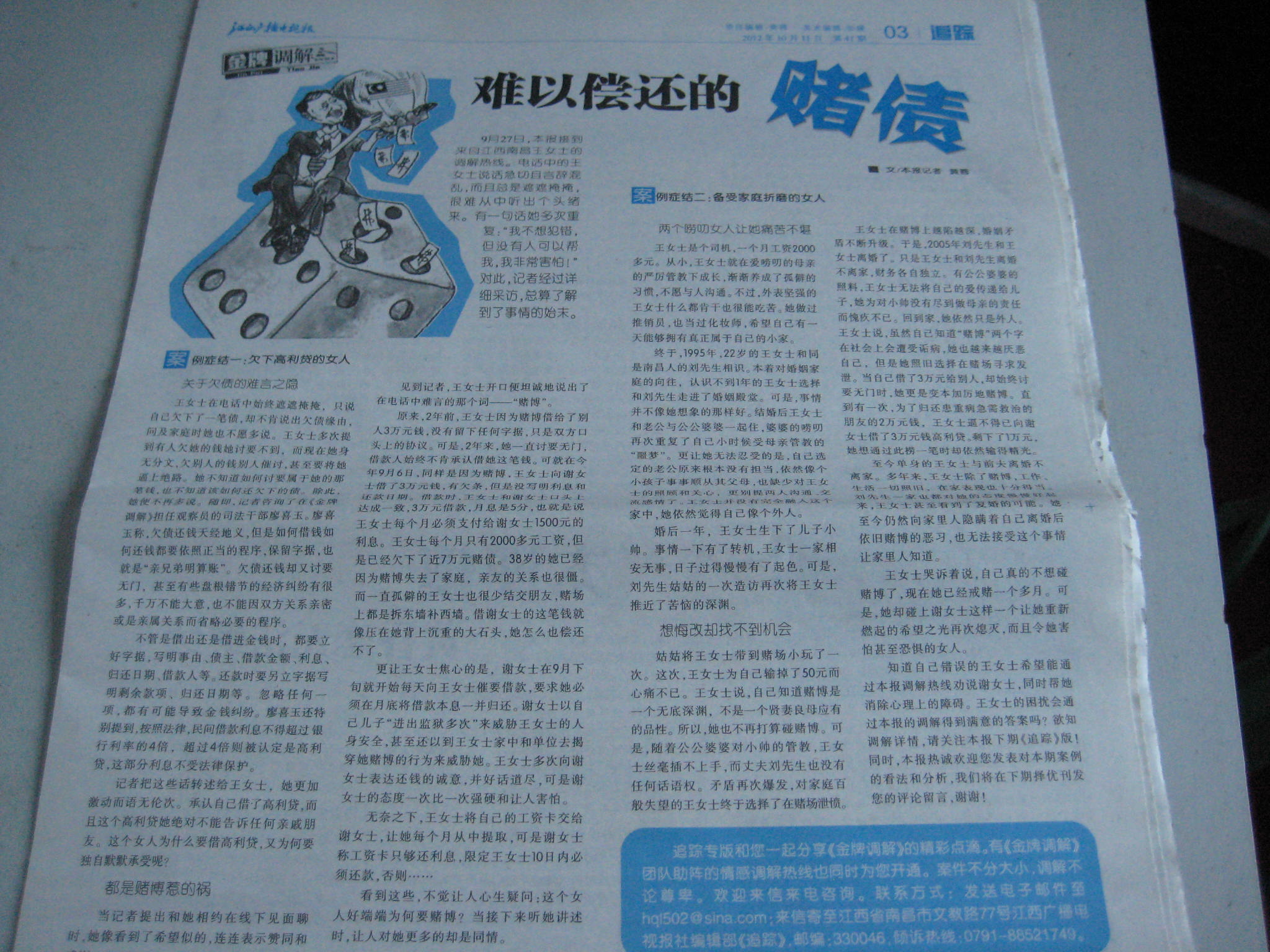 上期,本报追踪栏目介绍到来自南昌的王女士的关于赌债与家庭生活的困苦。王女士称,她的家庭情感问题一团糟,悄悄背负3万元高利贷,并深深受其伤害的王女士该如何通过调解走出困境,她的问题该如何解决呢?