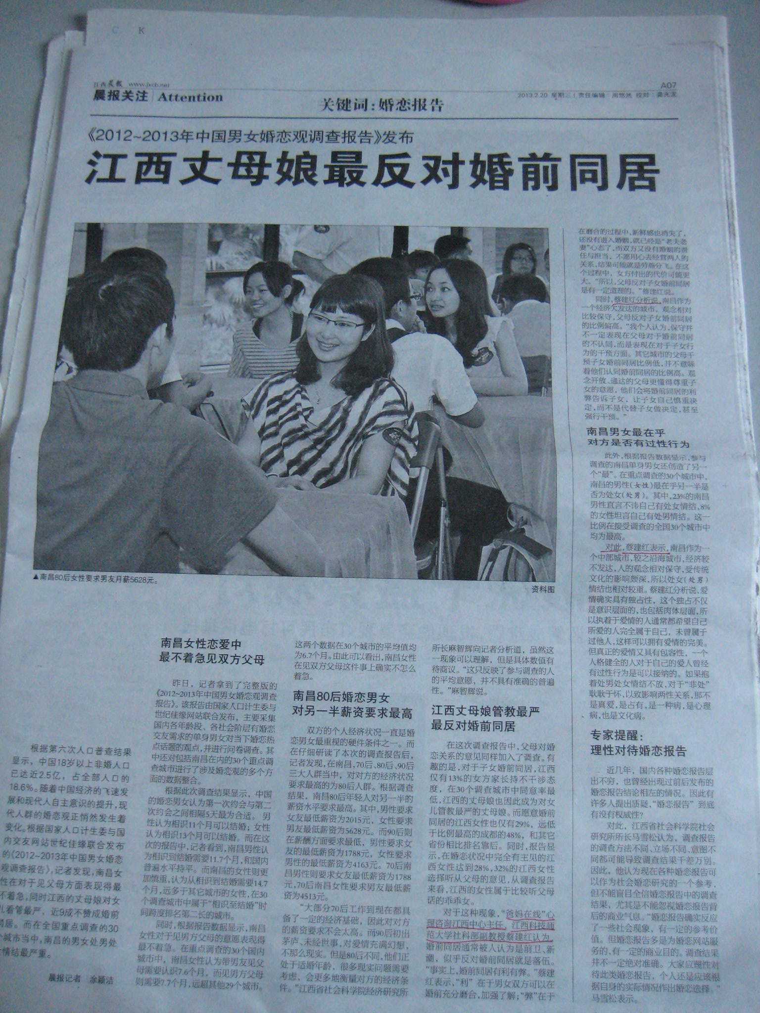 昨日,记者拿到了完整版的《2012~2013年中国男女婚恋观调查报告》。该报告由国家人口计生委与世纪佳缘网站联合发布,主要采集国内各年龄段、各社会阶层有婚恋交友需求的单身男女对当下婚恋热点话题的观点,并进行问卷调查。其中还对包括南昌在内的30个重点调查城市进行了涉及婚恋观的多个方面的数据整合。