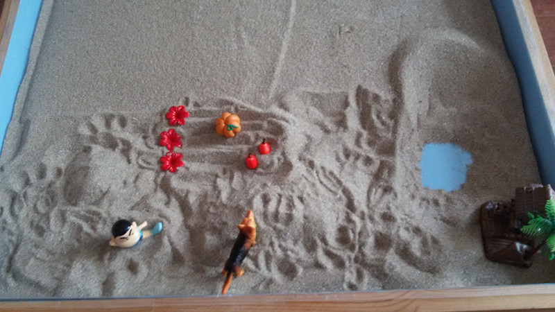 新悦第二次来到咨询室坐到沙盘前,我看到新悦的面部表情比第一次舒展了许多,我说:“感觉你的状态还可以”, 新悦对我说: “我在这一周感觉没有那么烦躁也不发脾气了。”我说:“太好了,这说明你可以调控自己的情绪了,你真棒。”新悦脸上露出了微笑。他说:“老师我是否可以继续玩沙盘。”我说:“可以的,和上次一样先抚沙,让自己放松下来之后在摆放玩具。”听了我的话后,新悦开始抚沙,他将上面的沙子推平,将下面的沙子堆成两个小山包,又画了一些沙画,之后在沙盘的右边挖了一个湖。大约7分钟后,新悦到玩具架前选择玩具,他拿了一个风车房玩具放在右下角,拿了一个狗放在中间下面的位置,拿了一个男孩放在左下面的位置,拿了三朵小红花,两个水果和一个南瓜放在中间的位置。之后新悦说,我做完了。这个制作过程用时13分钟。在这个制作过程中,我静静的陪伴着新悦,观察、感受着新悦。我感觉到新悦在用心感悟并感受玩具摆放在那里能让自己舒服,他完全沉静到沙盘游戏之中。