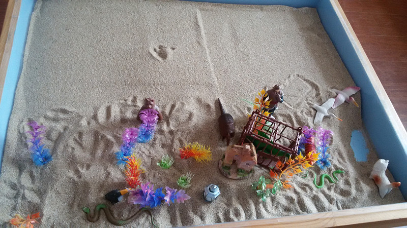 新悦先将沙子推平,在沙盘的右边挖了一个小湖,又在沙子上面画沙画。大约3分钟后新悦到玩具架前选择玩具,他拿了一些水草和小草放在下面,拿了一个房子放在中间下面的位置,拿了一个老虎放在右下方的位置,拿了一个穿山甲放在房子的前面,拿了两个水鸟放在湖的上方、一个熊放在中间的位置,一只小猫放在右下角,一个猎人放在右边中间的位置,5个印第安人放在左下方的位置,一个灯放在下方中间的位置,一只鸟两条蛇放在下方,一个笼子里面关了一只蜥蜴放在老虎的左边。之后新悦说,我做完了。这个制作过程用时25分钟。在这个制作过程中,我感受到了新悦内心世界的矛盾、焦虑与冲突。