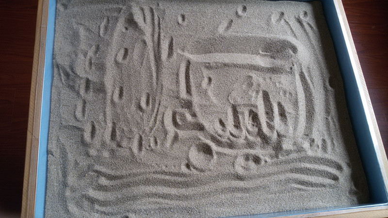 娴儿第三次走进心理咨询室坐好之后主动对我说:“老师,我这一周没有完成你留的作业,因为我实在是想不出来他对我的好了。”我说:“这样也好,你的男友对你的好你也都看清楚了,也就是你上一次说过你感觉到的和他呆在一起的好,其他的你也找不出什么好了,是这样吗?”娴儿说:“是这样的。”我说:“既然是这样,我们今天做一次沙盘游戏治疗,好好的认识一下自己的心灵深处真正想要的是什么好吗?”娴儿说:“好啊。”我向娴儿介绍了沙盘游戏治疗的规则之后,娴儿开始抚弄沙子,将自己放空。大约3分钟左右,娴儿问我:“老师,我可以在沙子上面画画吗?”我说:“可以的。”娴儿开始在沙盘上作画,10分钟后娴儿的作品制作完成。