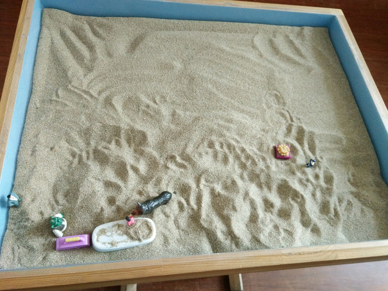 新悦先将沙子推平,在沙子上面画沙画。大约2分钟后新悦到玩具架前选择玩具,他拿了一个男人放在左侧下面,拿了一个正在干活的工人放在右侧中间的位置,拿了一个狗放在下方的位置,拿了一个洗澡盆反扣着放在下面,拿了一个女人放洗澡盆的上面,一个录音机放在左下方的位置,一个食物放在右侧中间的位置,一个绿色的人放在左侧下方。之后新悦说,我做完了。这个制作过程用时17分钟。在这个制作过程中,我感受到了新悦内心世界平静了许多。