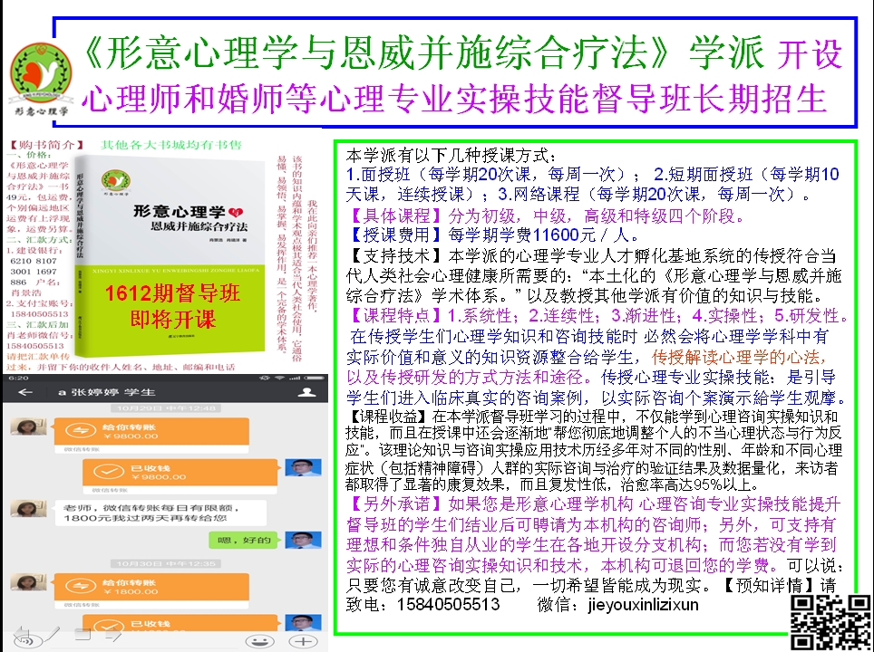 【课程收益】在本学派督导班学习的过程中,不仅能学到心理咨询实操知识和技能,而且在授课中还会逐渐地“帮您彻底地调整个人的不当心理状态与行为反应”。该理论知识与咨询实操应用技术历经多年对不同的性别、年龄和不同心理症状(包括精神障碍)人群的实际咨询与治疗的验证结果及数据量化,来访者都取得了显著的康复效果,而且复发性低,治愈率高达95%以上。